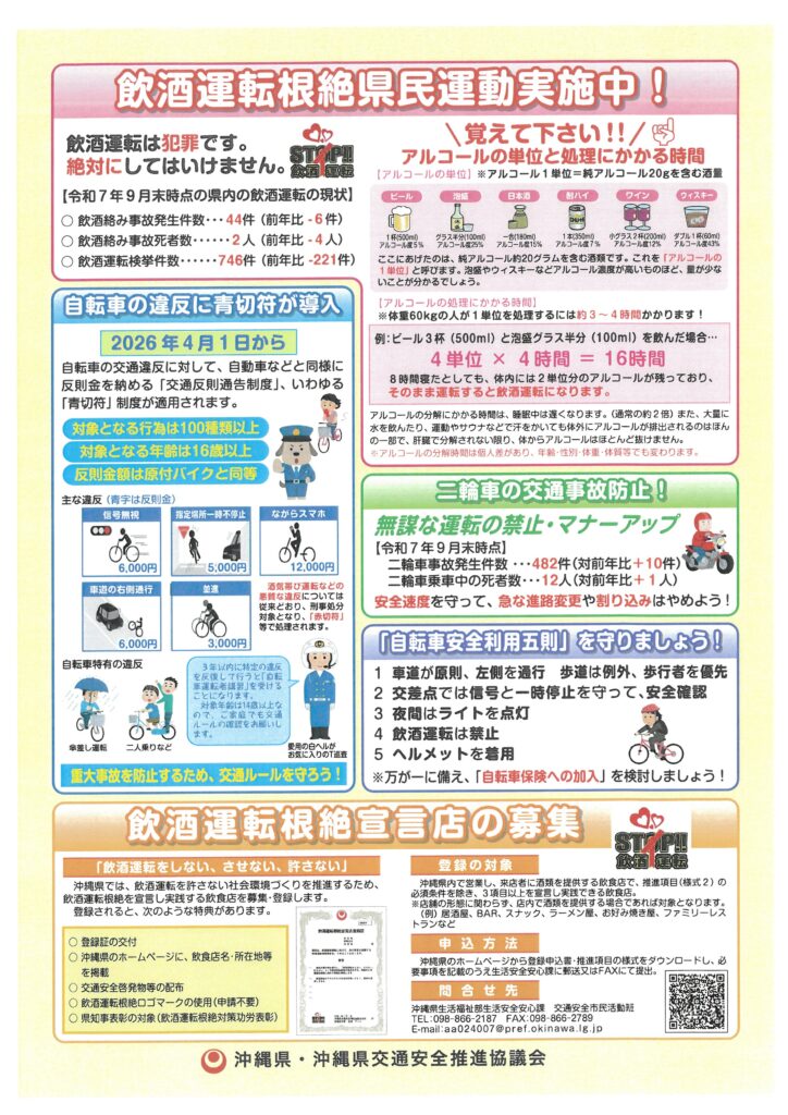 春の全国交通安全運動 2026.04.06 新しい年度がスタートしました。 4月は新入生や新社会人はもちろん、多くの人の生活に変化がある時期です。 不慣れな生活環境から交通事故も発生する時期でもあるかと思います。 「交通ルールを守って 交通事故ゼロへ!」を モットーに安全運転を心がけましょう!! 期間:令和8年4月6日(月) ~ 4月15日(水) ※4月10日(金)は「交通事故死ゼロを目指す日」です。 前の記事 一覧