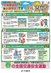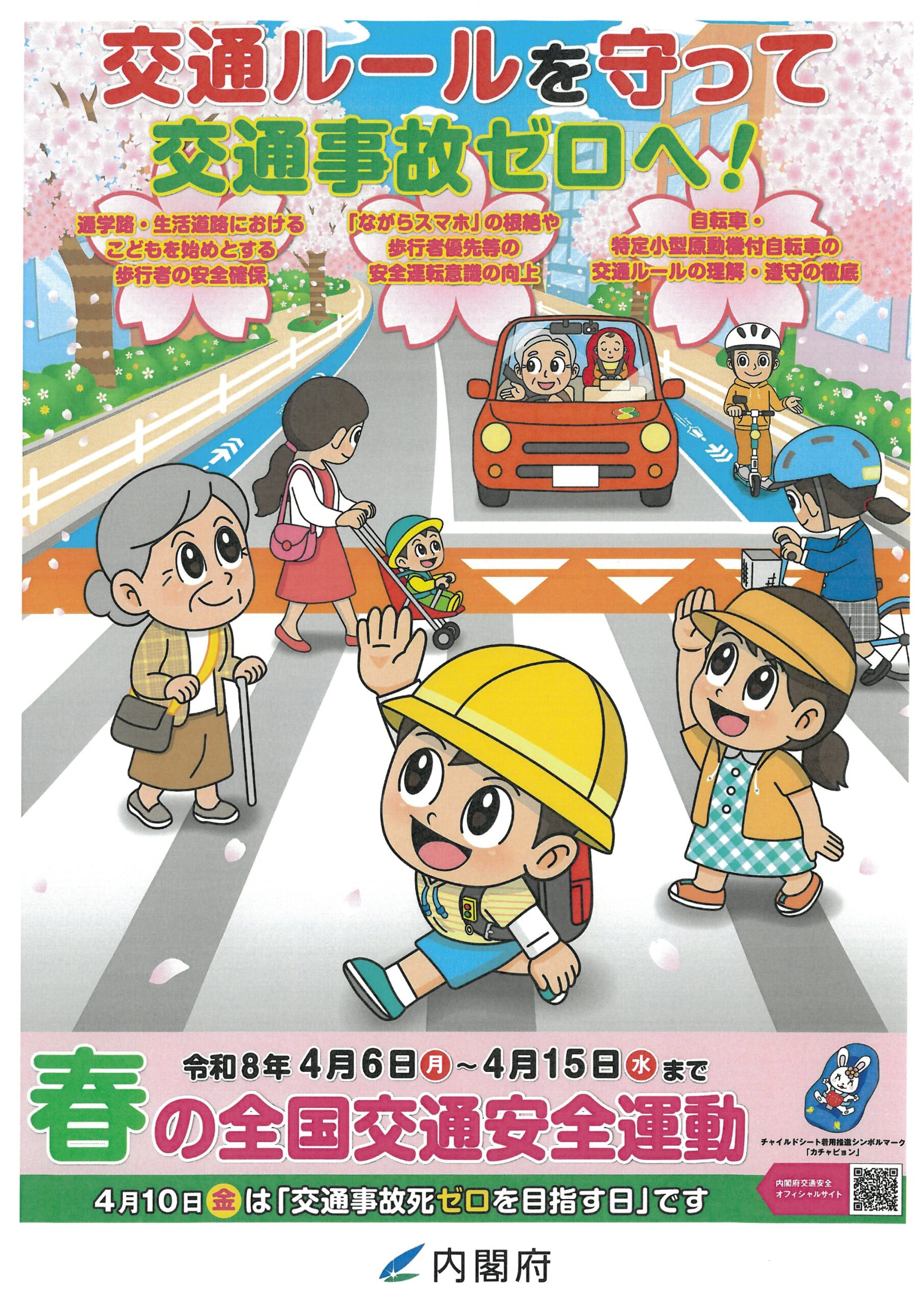 春の全国交通安全運動 2026.04.06 新しい年度がスタートしました。 4月は新入生や新社会人はもちろん、多くの人の生活に変化がある時期です。 不慣れな生活環境から交通事故も発生する時期でもあるかと思います。 「交通ルールを守って 交通事故ゼロへ!」を モットーに安全運転を心がけましょう!! 期間:令和8年4月6日(月) ~ 4月15日(水) ※4月10日(金)は「交通事故死ゼロを目指す日」です。 前の記事 一覧